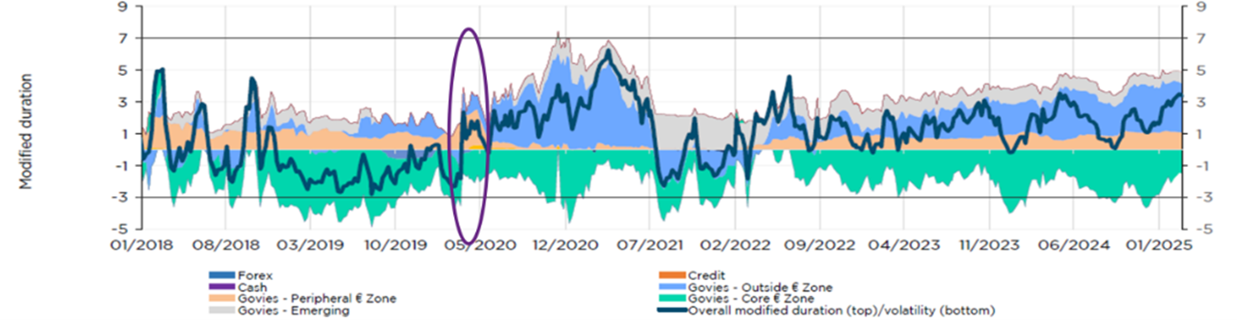 From February 17 to March 18, 2020, the strategy fell more than 10% its biggest loss ever. However, its flexible setup and high liquidity enabled it to quickly adjust to the new market conditions. The team closed their short position in G10 government bonds and shifted to long G10 government bonds, while maintaining a long position on inflation, with US TIPs. One of the reasons the strategy has such flexibility is because it invests in highly liquid securities like G10 government bonds. You can see in the graph below the big shift the team made in duration and overall positioning in early 2020.